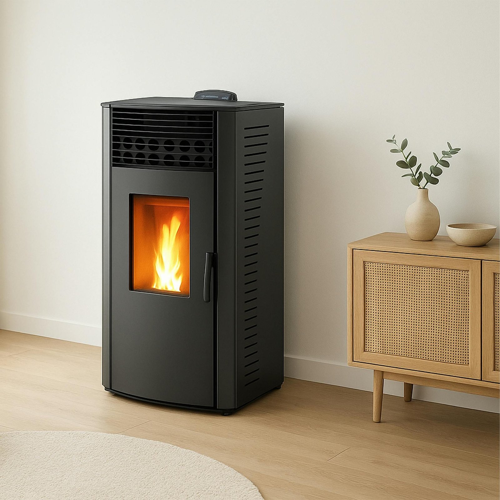 Doble combustión, aire ventilado, dimensiones compactas, fácil mantenimiento, programable, sensor de atmósfera integrado, crisol grande, muy silencioso, cenicero extraíble, salida de humos en la parte trasera. Un diseño de estufa impermeable y fácil de usar. Esta estufa de pellets tiene una potencia nominal de 10,6 kW, esto representa la potencia obtenida en las mejores condiciones de uso de la estufa. En cuanto a la potencia máxima, aquí de 12,2 kW, se mide durante el pico de calor de su estufa. Como la mayoría de las estufas de pellets, el rendimiento se expresa en potencia máxima.